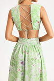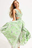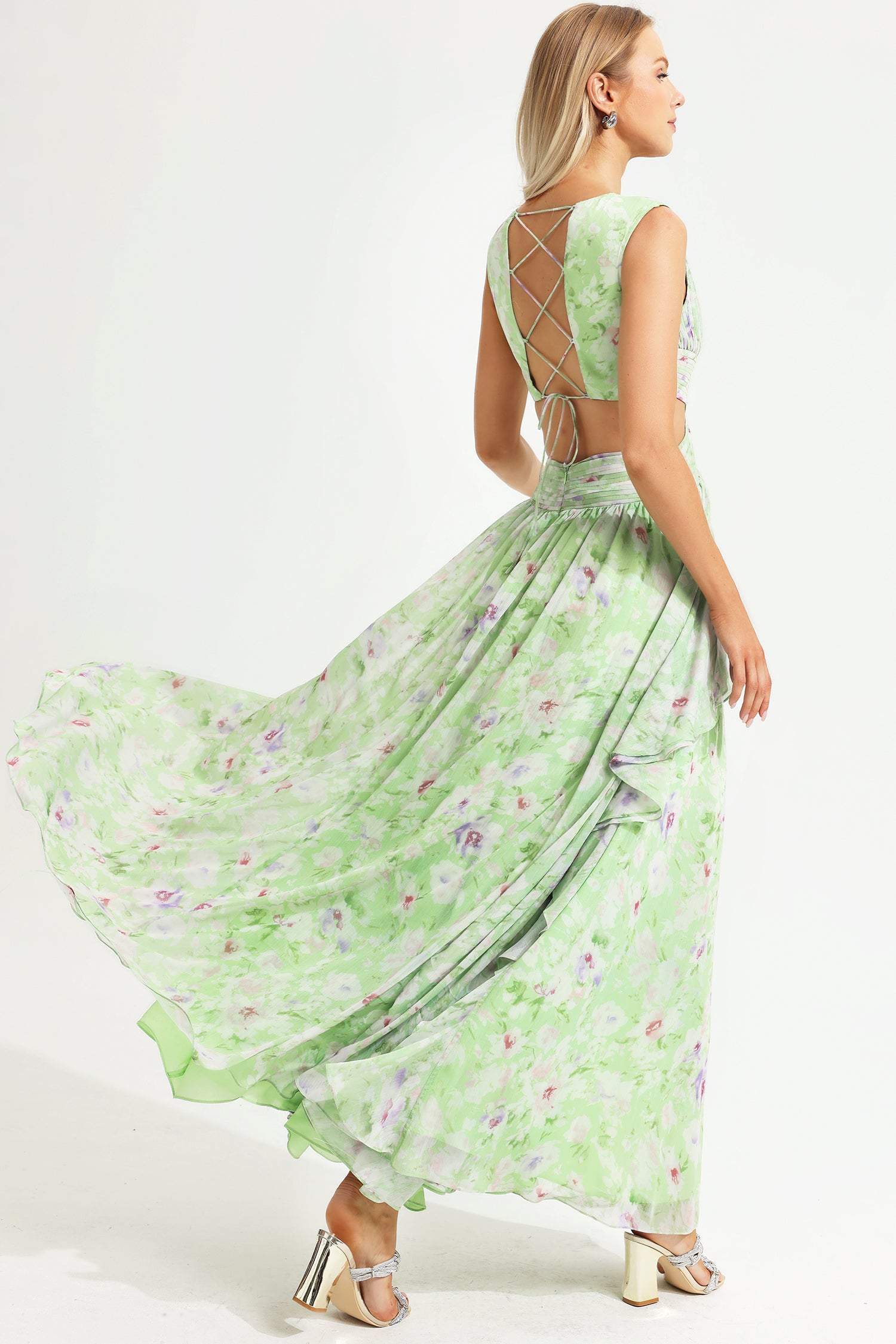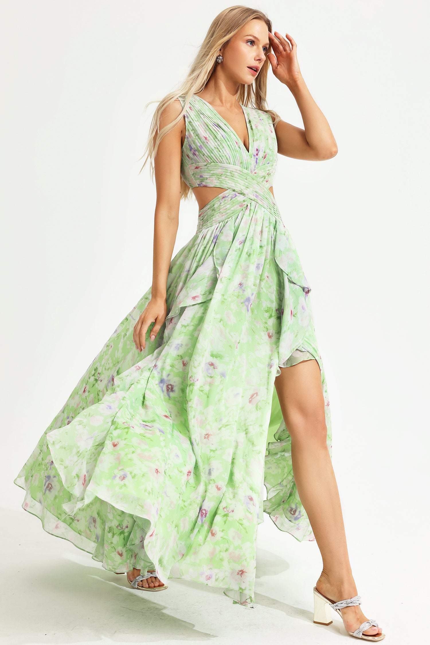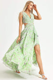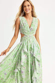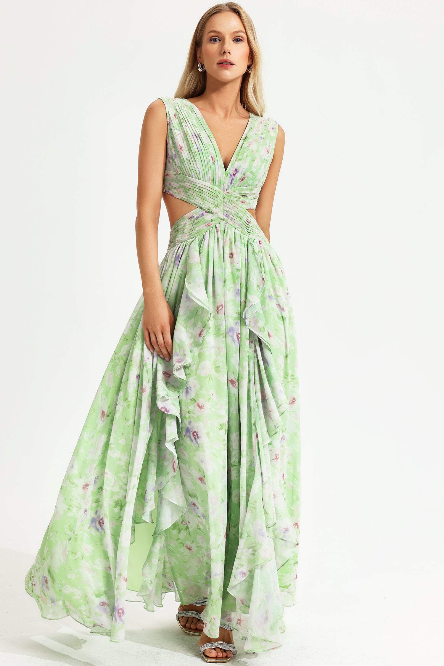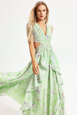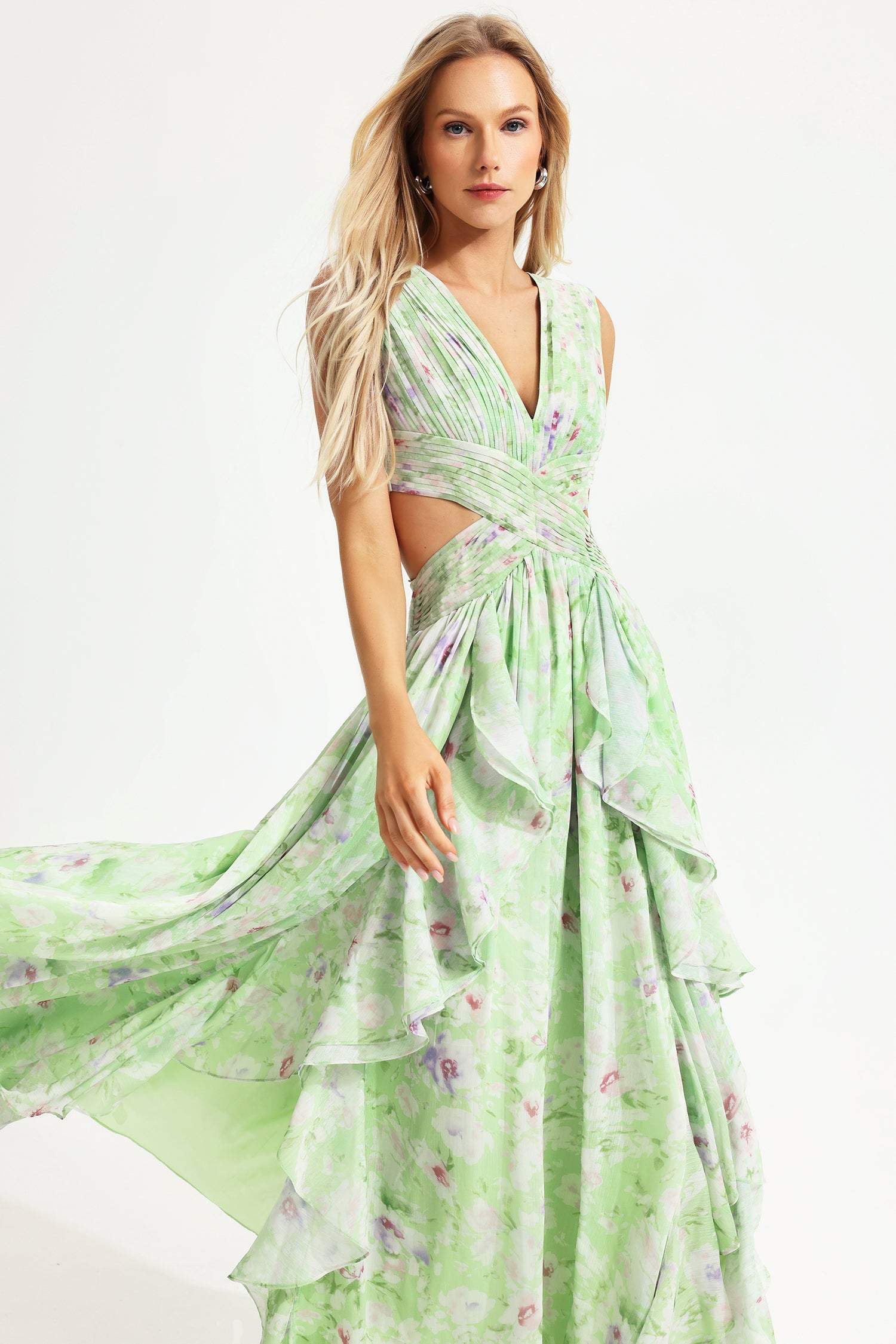 - Scollo a V, stampa floreale, plissettato, cutout, orlo a volant a più livelli